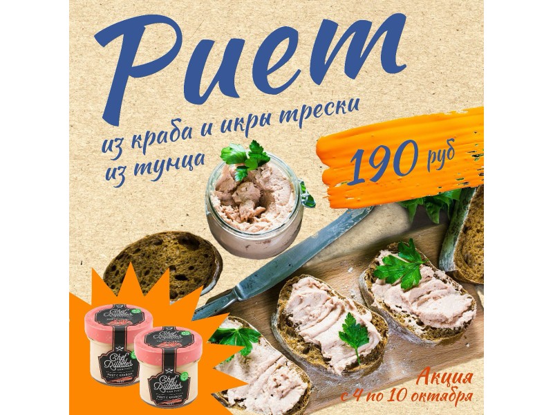 Риет «Путина» с камчатским крабом из икры тихоокеанской трески с добавлением молок лососевых идеально подходит для приготовления бутербродов, тарталеток, канапе и других закусок.